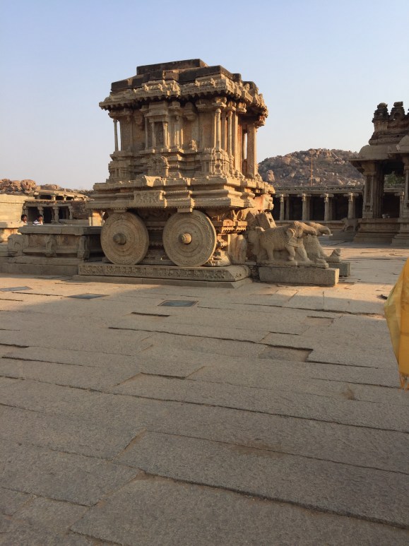 थपथपाने पर उनमें संगीत लहरियाँ निकलती हैं।हाल के पूर्वी हिस्से में प्रसिद्ध शिला–रथ है,जो वास्तव में पत्थर के पहियों से चलता था।“हम्पी” में ऐसे अनेक आश्चर्य हैं,जैसे यहाँ के राजाओं को अनाज,सोने और रूपयों से तोला जाता था और उसको ग़रीब लोगों में बाँट दिया जाता था।इसके अतिरिक्त कमल महल और जनानखाना आदि भी ऐसे